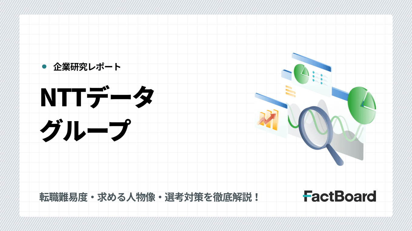 当サイトはFactBoard株式会社が運営しています。本ページは一部PRを含みます。この記事では、NTTデータグループへの転職を検討している方に向けて、転職難易度や平均年収、福利厚生、中途採用(キャリア採用)の選考フロー・対策方法など、転職情報をお伝えしていきます。 NTTデータグループはもちろん、ITサービス業界に興味のある方は、ぜひ参考にしてみてください。