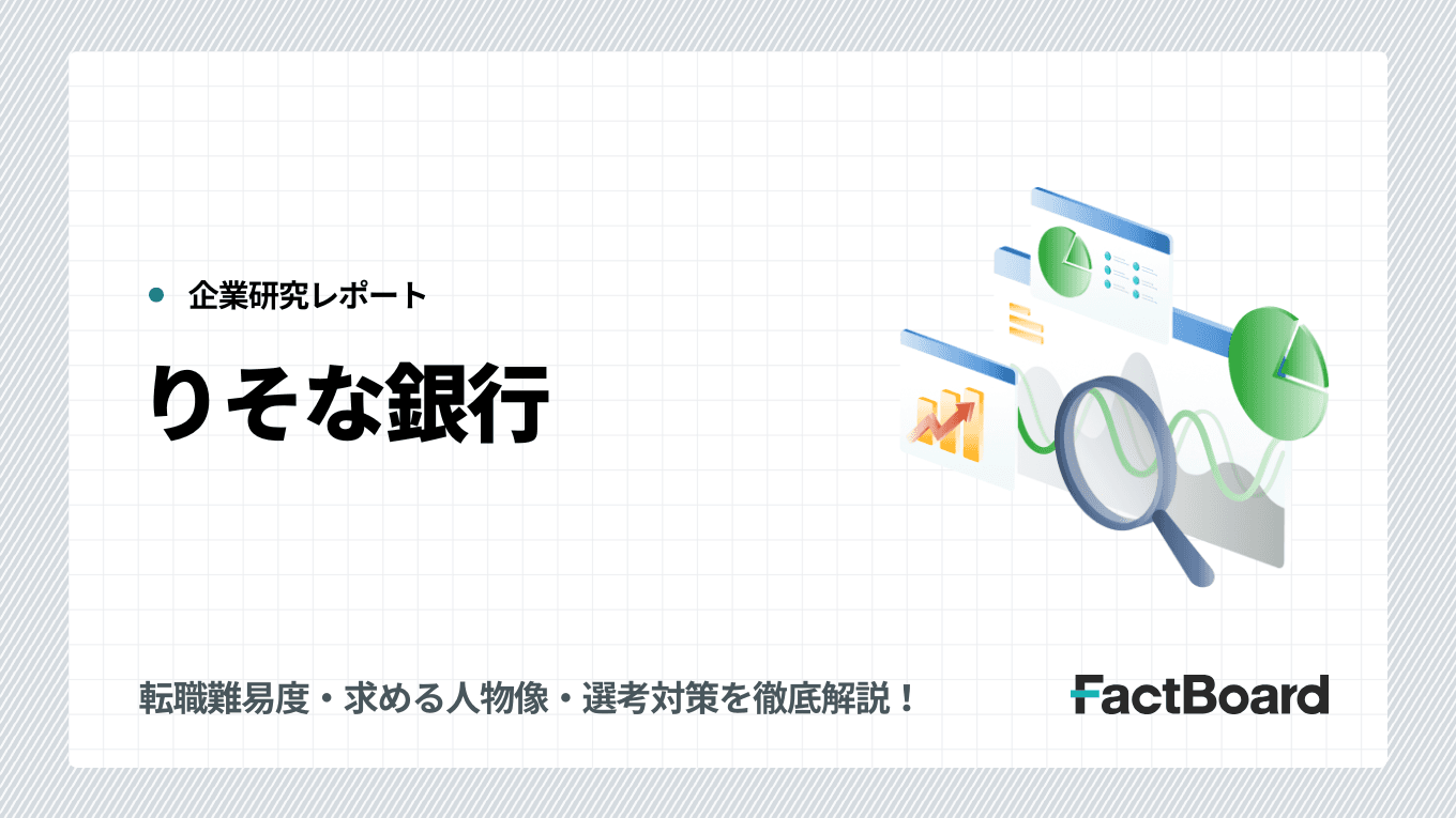 当サイトはFactBoard株式会社が運営しています。本ページは一部PRを含みます。この記事では、りそな銀行への転職を検討している方に向けて、転職難易度や平均年収、福利厚生、中途採用(キャリア採用)の選考フロー・対策方法など、転職情報をお伝えしていきます。