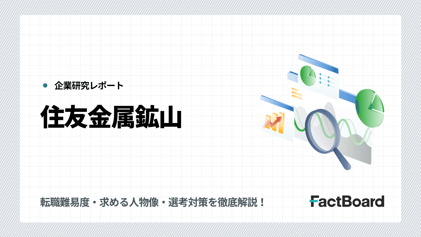 当サイトはFactBoard株式会社が運営しています。本ページは一部PRを含みます。この記事では、住友金属鉱山への転職を検討している方に向けて、転職難易度や平均年収、福利厚生、中途採用(キャリア採用)の選考フロー・対策方法など、転職情報をお伝えしていきます。